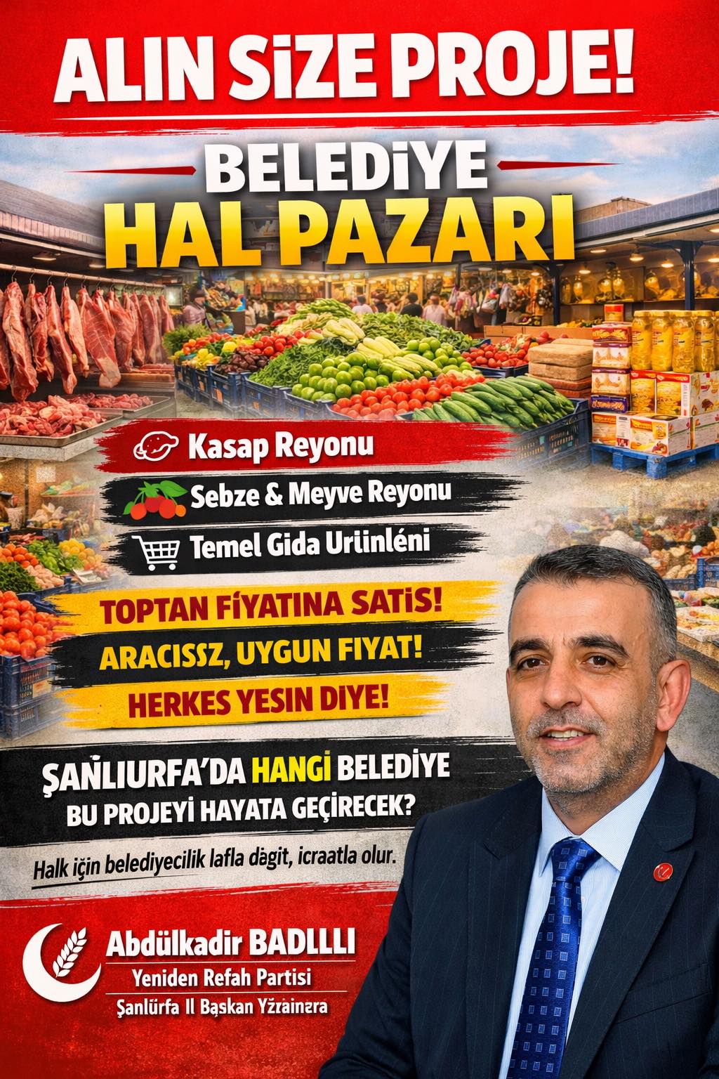Yeniden Refah Partisi Şanlıurfa İl Başkan Yardımcısı Abdulkadir Badıllı, kentte uygulanması önerilen yeni belediyecilik projesini kamuoyuyla paylaştı. Badıllı, sosyal medya üzerinden yaptığı açıklamada projeyi “Alın size proje!” diyerek duyurdu.Proje kapsamında, vatandaşların temel gıda ihtiyaçlarını toptan fiyatına ve aracısız temin edebileceği bir Belediye Hal Pazarı kurulması planlanıyor. Hal pazarında;