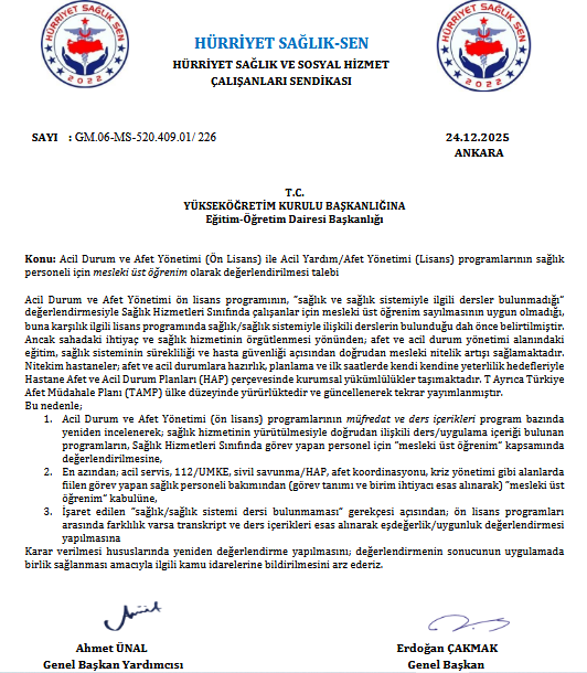 Hürriyet Sağlık-Sen Genel Merkezi tarafından YÖK Eğitim-Öğretim Dairesi Başkanlığı’na sunulan başvuruda, Acil Durum ve Afet Yönetimi ön lisans ve lisans programlarının sağlık personeli açısından mesleki yeterliliği artırdığına dikkat çekildi. Başvuruda, afet ve acil durum yönetimi eğitiminin sağlık sisteminin sürekliliği, hasta güvenliği ve kriz anlarında etkin müdahale açısından doğrudan katkı sağladığı vurgulandı.