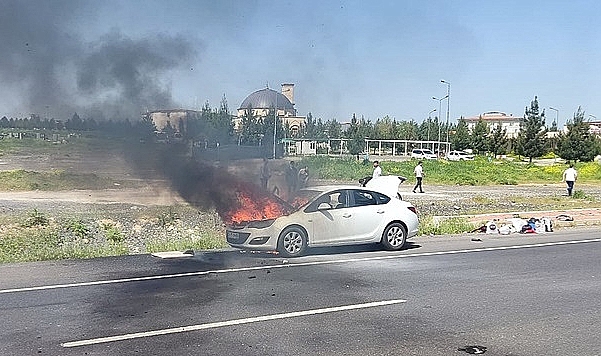 Şanlıurfa - Diyarbakır Karayolu Hilvan Cezaevi önünde seyir halindeki araç yanmaya başladı.